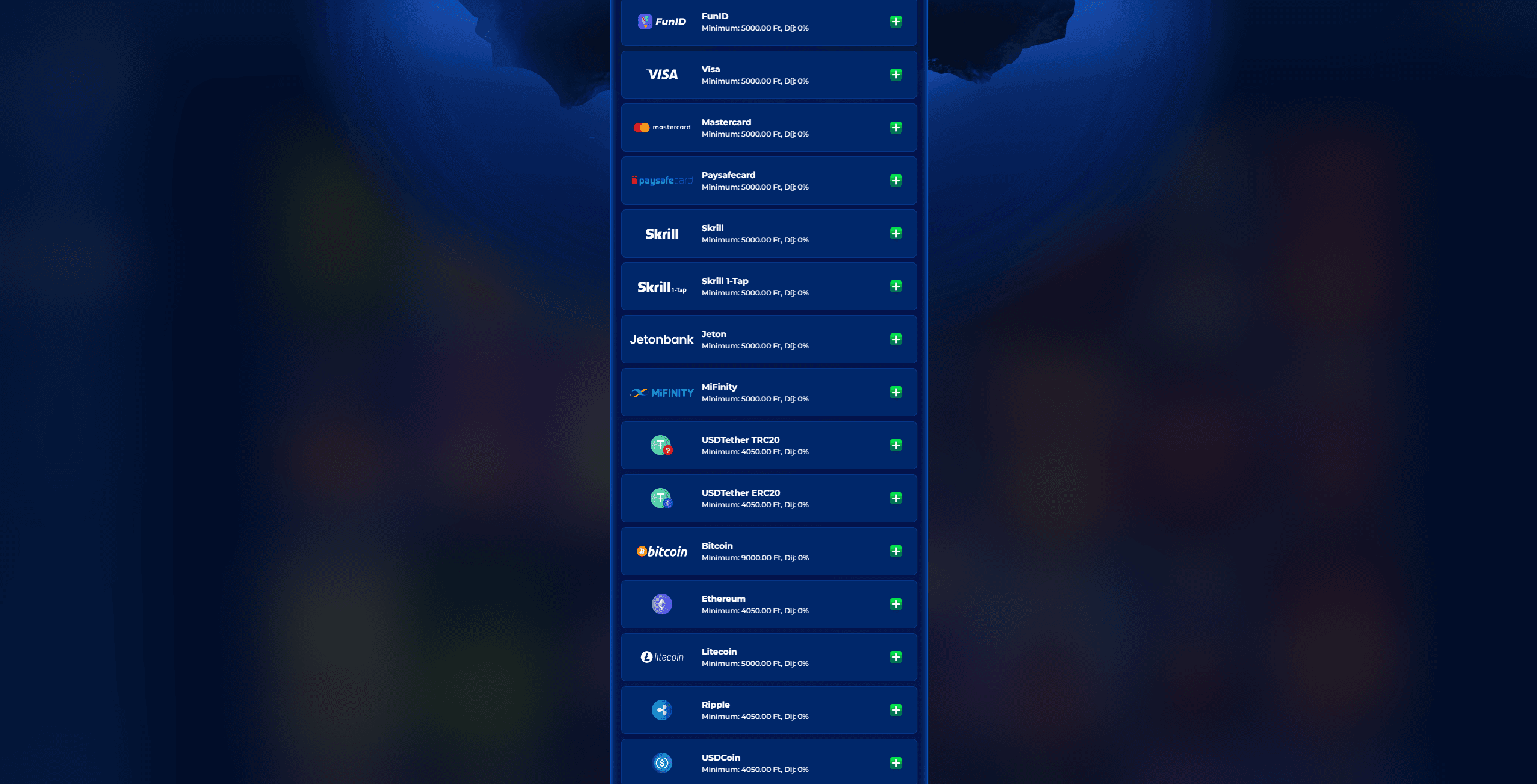 - Kriptovaluták (BTC, ETH, USDT, LTC stb.)
