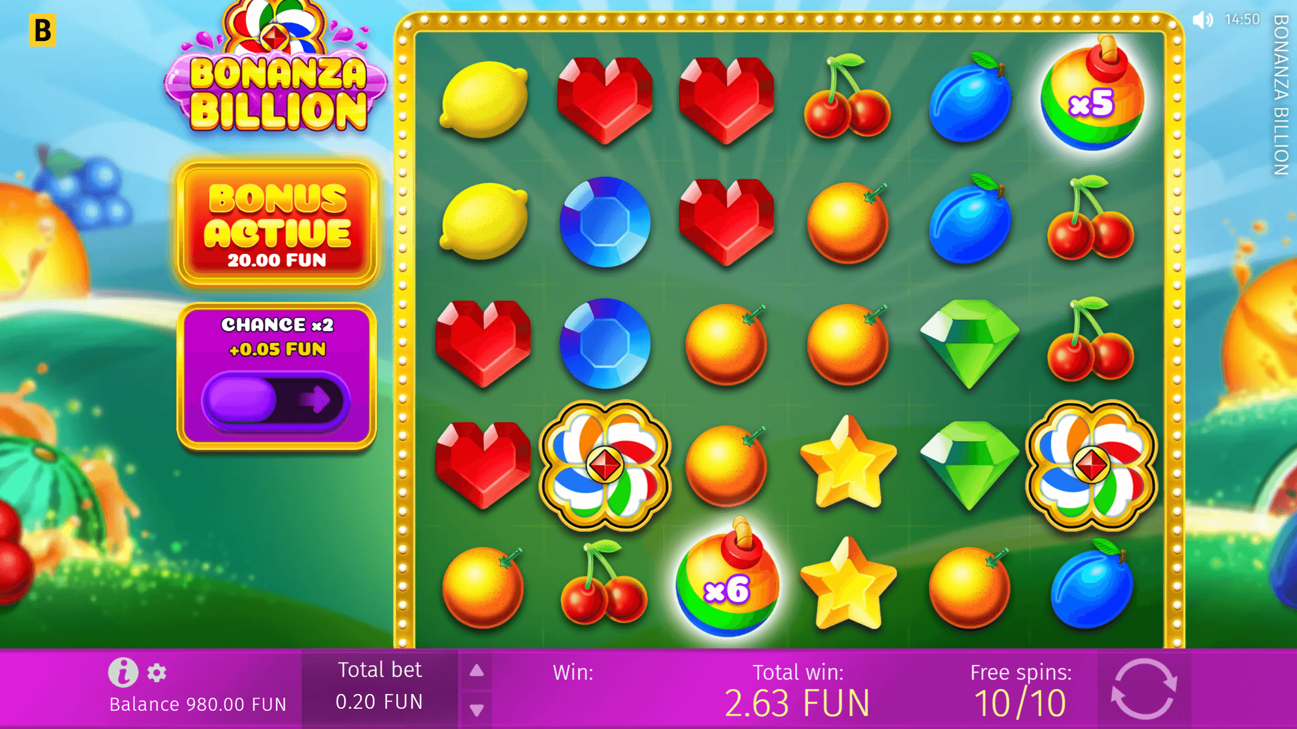 Bonanza Billion a BGaming „cukorka + gyümölcs” klónja, ahol a 6 × 5‑ös rácson hulló scatter pays kombók, a 2×–100×‑os Multiplier Bomb ikonok és a megvásárolható bónuszkör akár 15 000× kifizetésig pörgethetik a bankrollt. A gondosan balanszolt Buy Bonus (100× tét) és a Chance x2 ante‑tét (+25 %) miatt a játék tempója teljesen rád bízható: vagy türelmesen grindelsz a 96 %-os RTP‑vel, vagy gyorsan odalépsz a gáznak. Ha imádod a Sweet Bonanza‑féle „bombaszorzós” őrületet, ez a neon‑diner kötelező desszert.