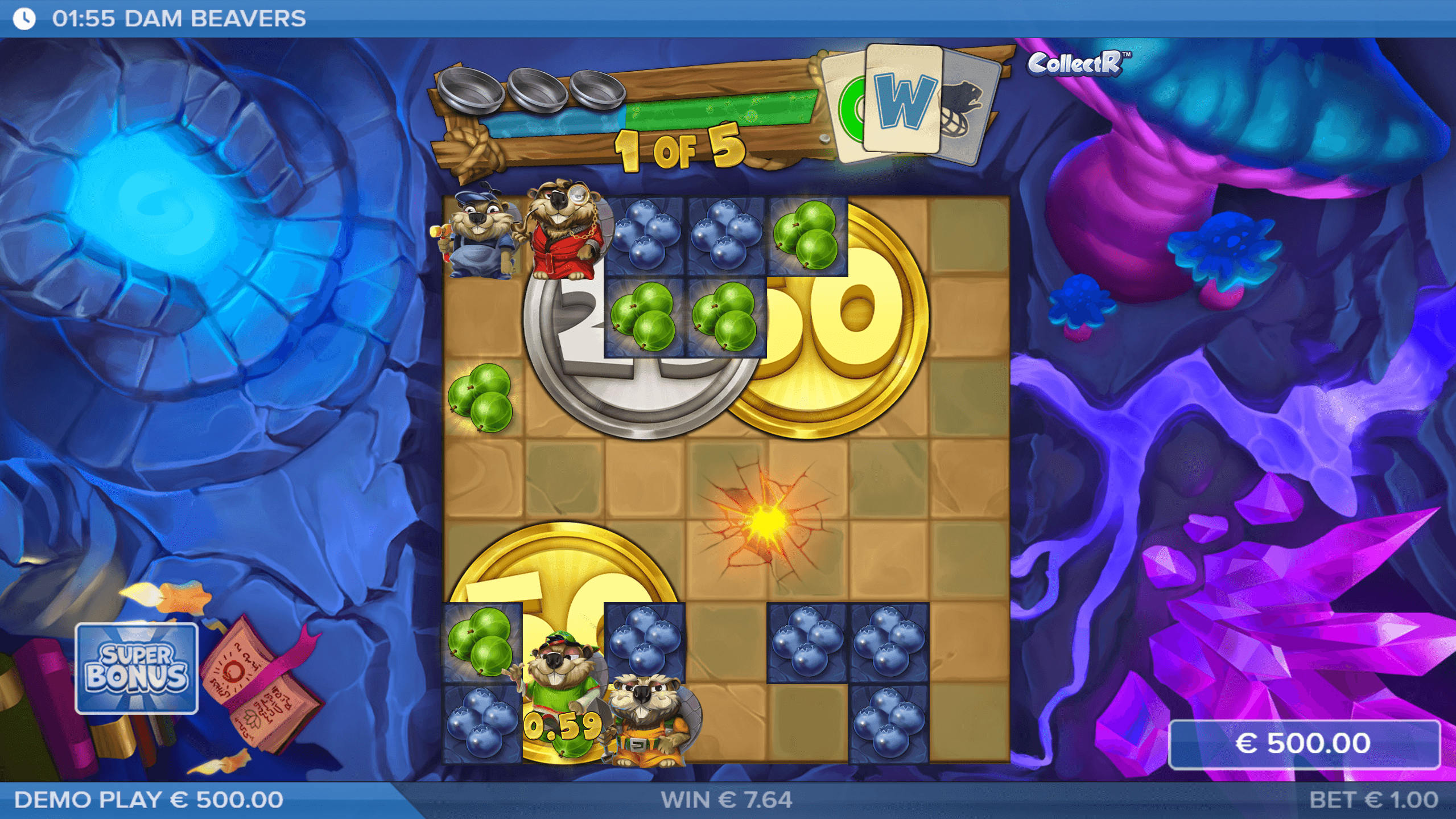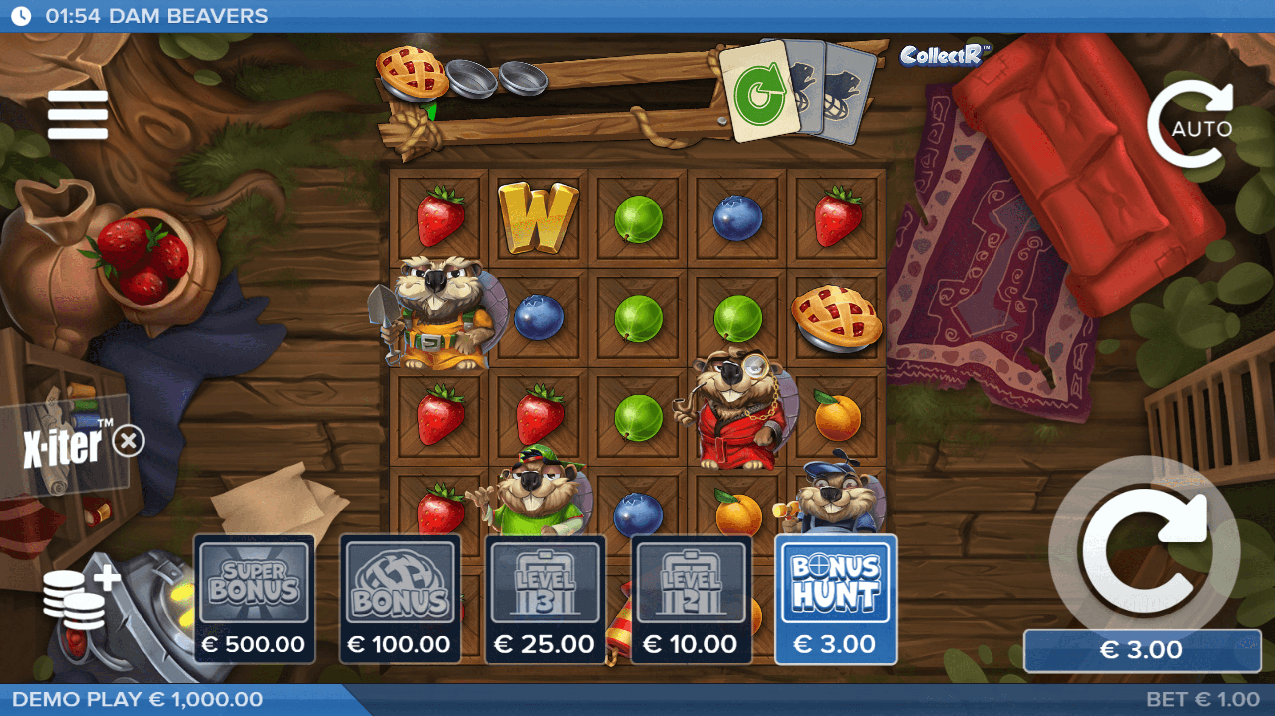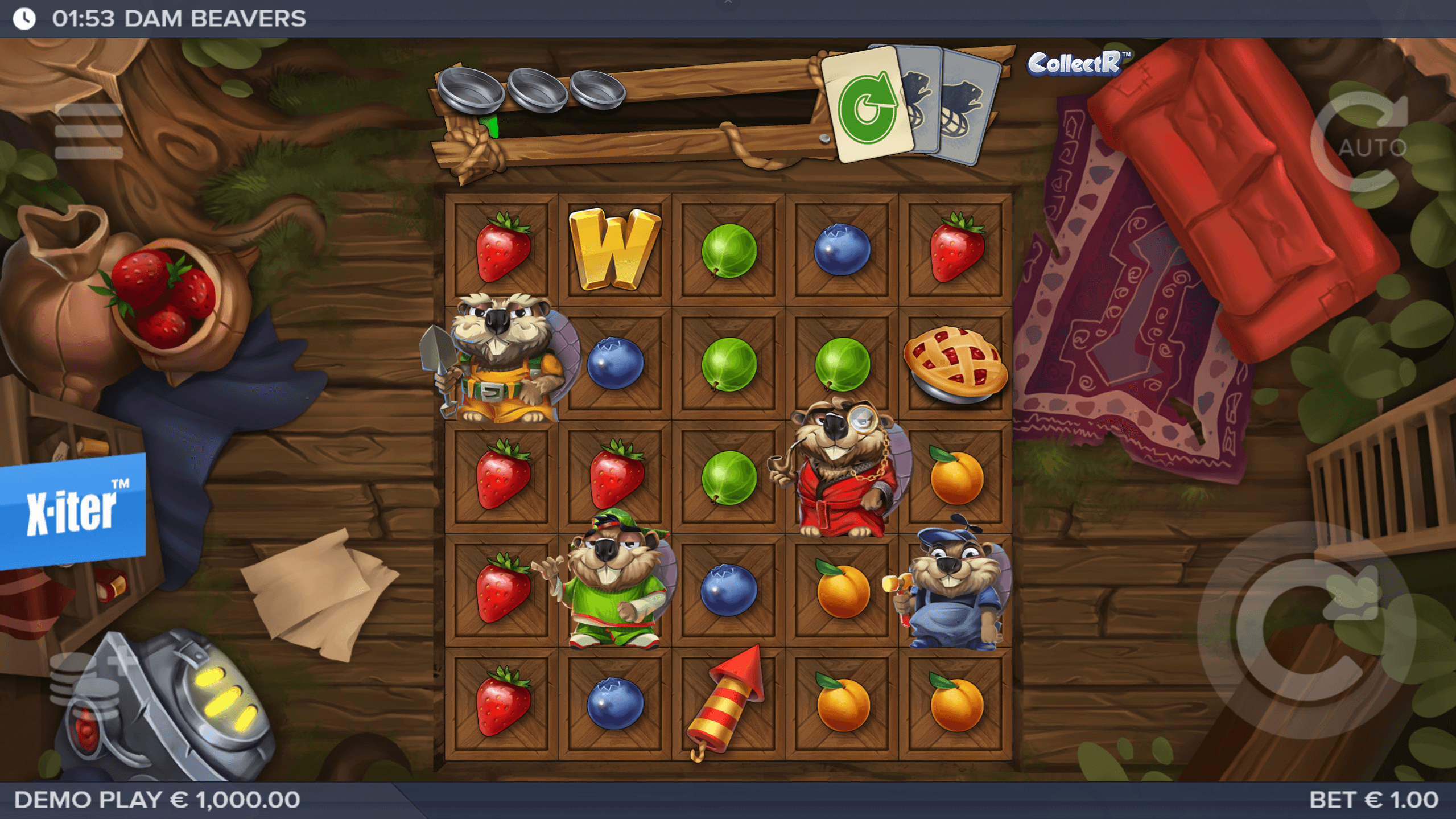 A játék 5 × 5‑ös rácson indul, de a padlódeszkák feltörésével 6×6 → 7×7 → 8×8 méretig nőhet. Nyerővonalak nincsenek: a négy színkódolt hód azonos színű gyümölcs‑klasztereket gyűjt (CollectR), amelyek eltűnnek, új elemek esnek be, és töltik a Feature Meter‑t. Tét: 0,20 € – 100 €, találati arány 24,8 %.