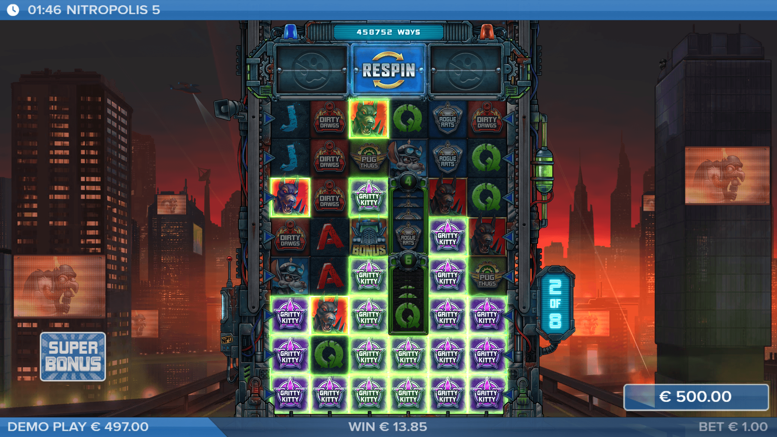 A free spins indításakor a rács legalább 4 sort nyit, majd minden nyerő kaszkád után Safety Level-t lépsz: ezek a sorok a funkció végéig megmaradnak, és a ragadós Nitro Reels egyre többet fizetnek. A Super Bonus mindezt megduplázza „Both Ways” kiértékeléssel és állandó NPD Holding Cellel – itt rejlik a 50 000× potenciál.