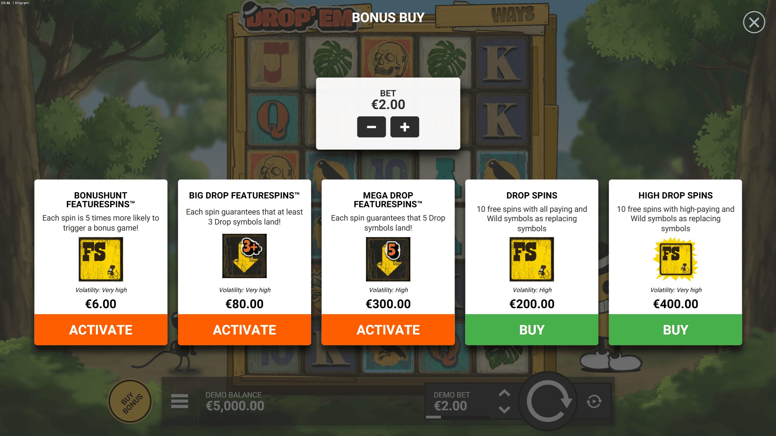 Bonus Buy & FeatureSpins: 3× (Bonushunt), 40× (Big Drop – ≥3 Drop/spin), 150× (Mega Drop – ≥5 Drop/spin), 100× (Drop Spins), 200× (High Drop), 300× (Wild Drop).