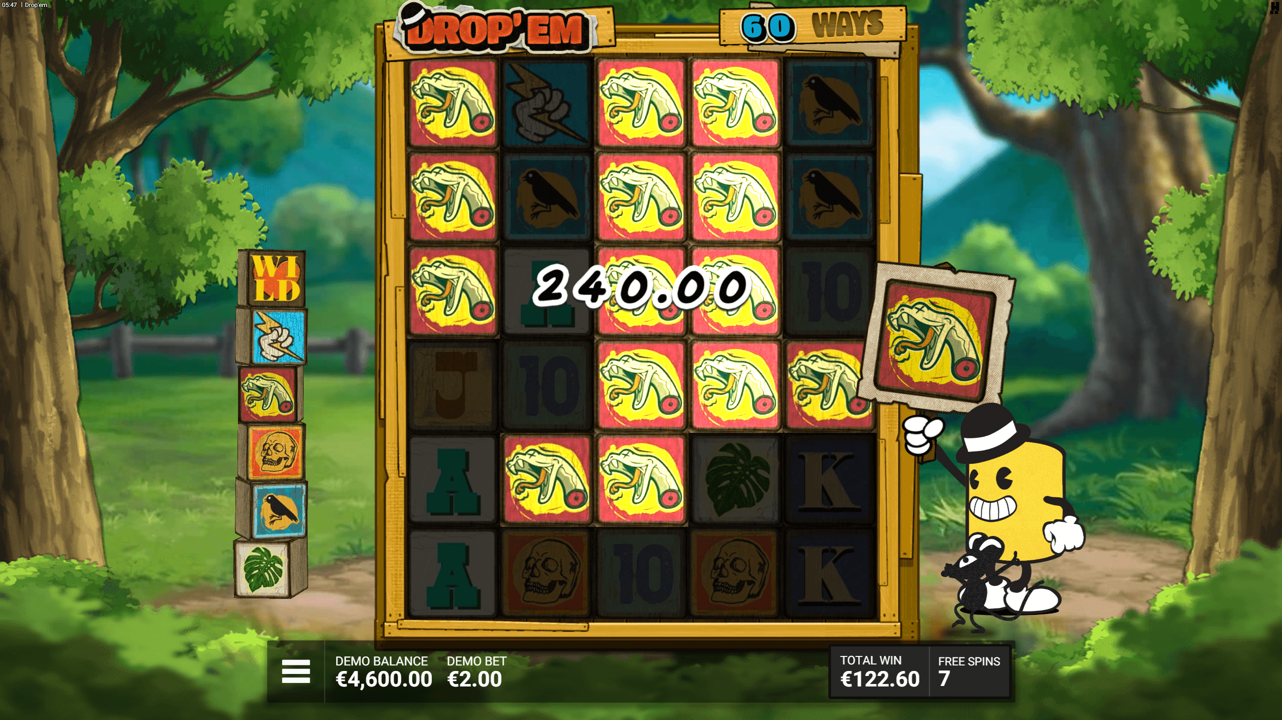 Wild Drop Spins (5 scatter, 10 FS): a Drop kizárólag wildokat pakol – minden zuhanás garantált vadlávina. További scatter 1–3 extra spint ad.