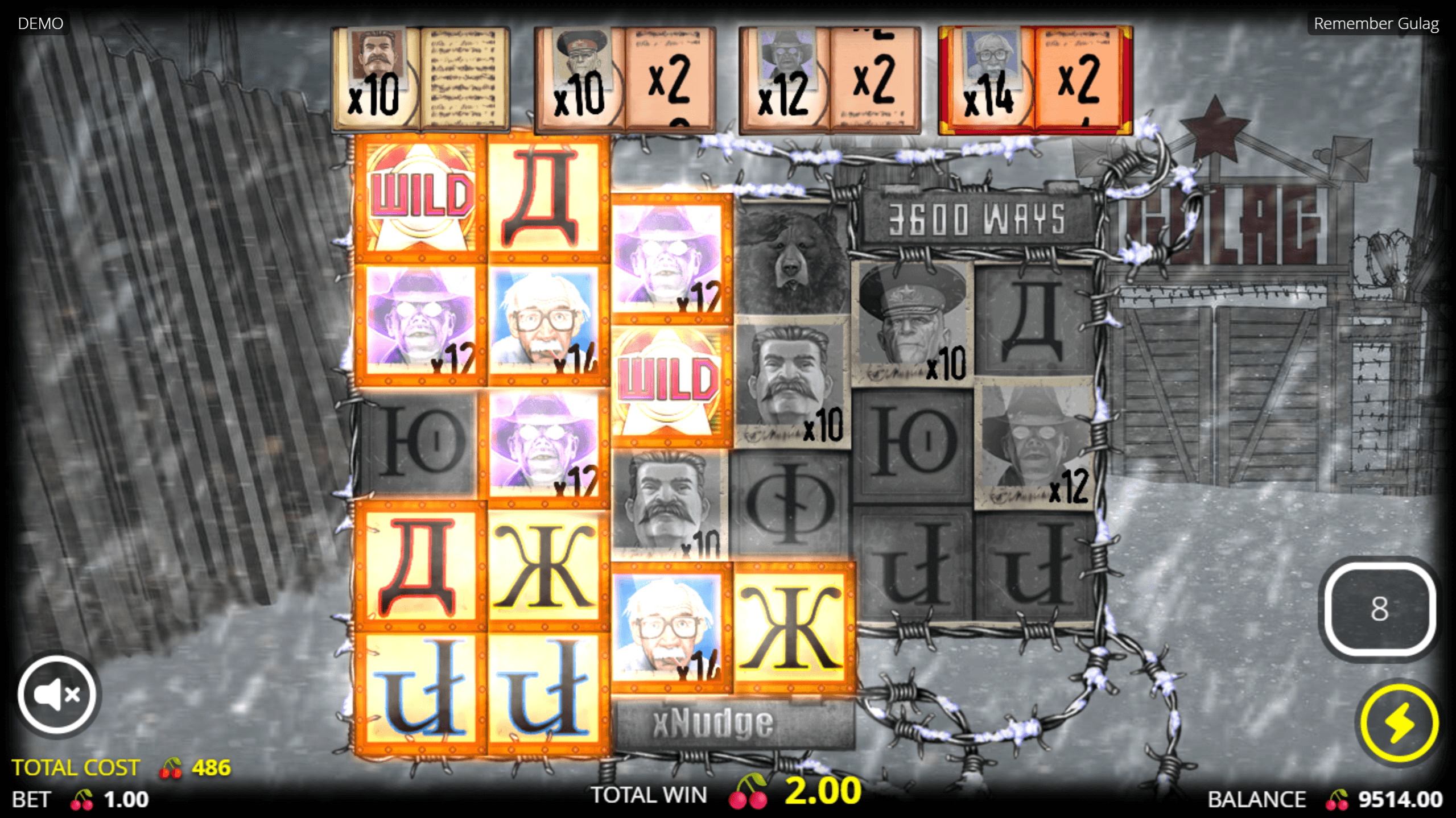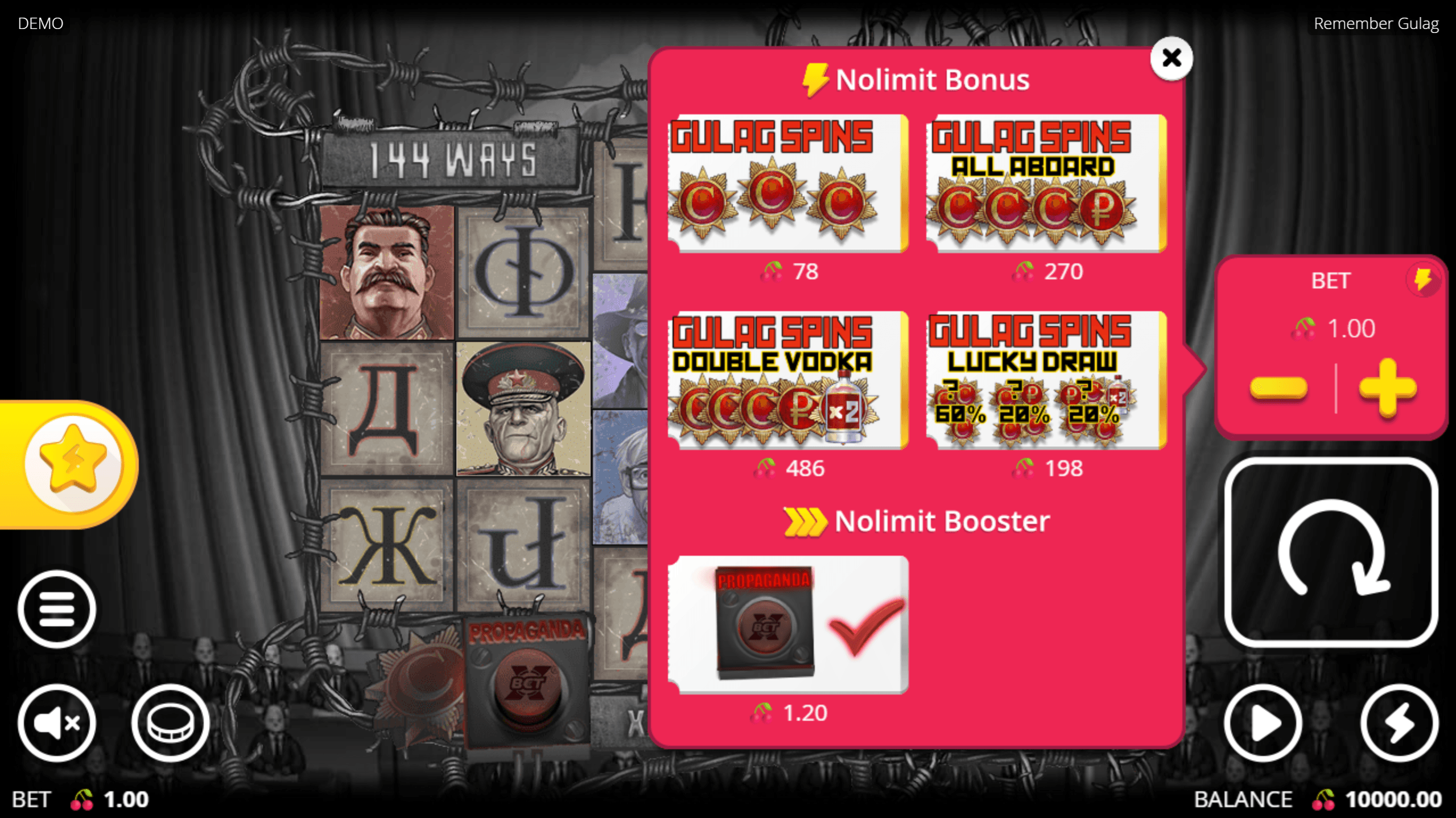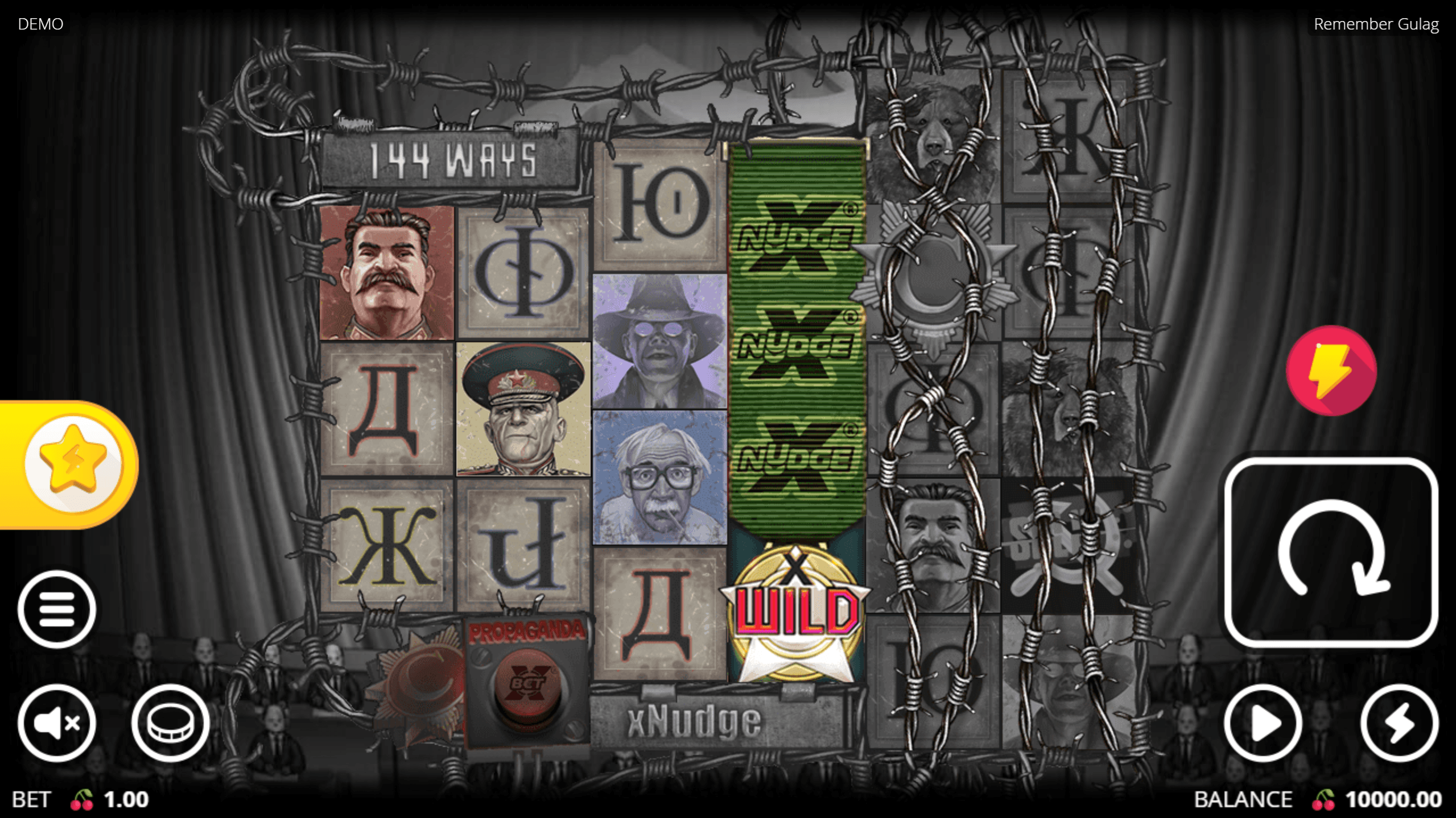 Gulag Spins (3 scatter): 8–? pörgetés; 1 prémium kap induló szorzót, a felső „propaganda” sáv +1/2 vagy duplázással növeli.