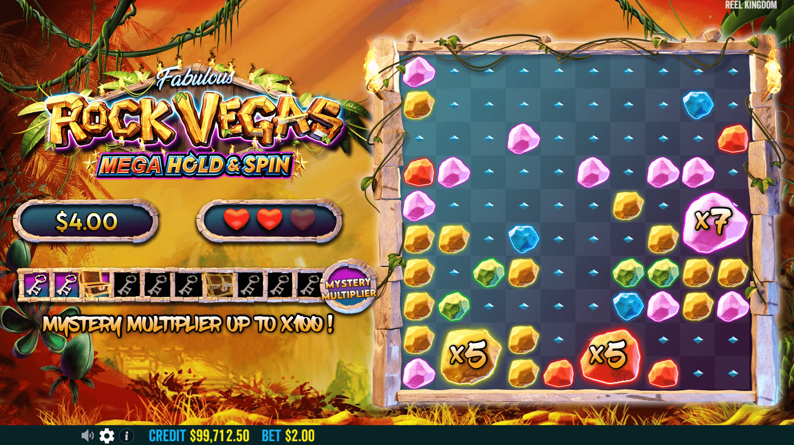 Mega Hold & Spin: 3, 4 vagy 5 Bonus Rock aktiválja; egy 10×10-es rácson indulsz 3 respinnel.
