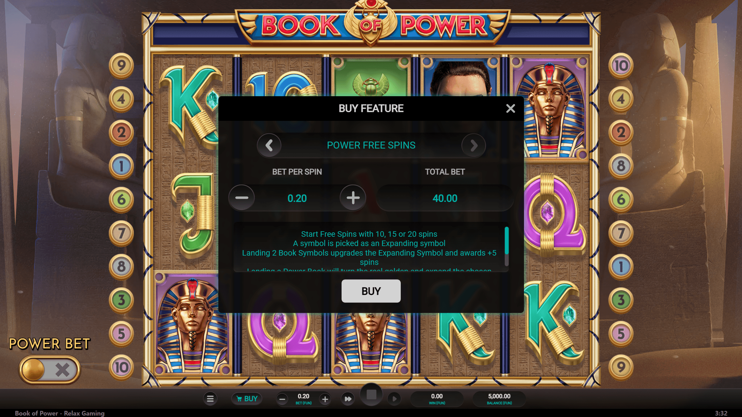 Power Free Spins: legalább egy Power Book a triggerek közt – ugyanannyi spin és payout, de az 2–4. tárcsán aranykeretes „Power Reel” aktiválódik, ahol az expander akkor is kiterjed, ha maga nem landolt. Retriggerenként vagy Power Book érkezésénél +1 rétegszorzó (max ×9) jár.