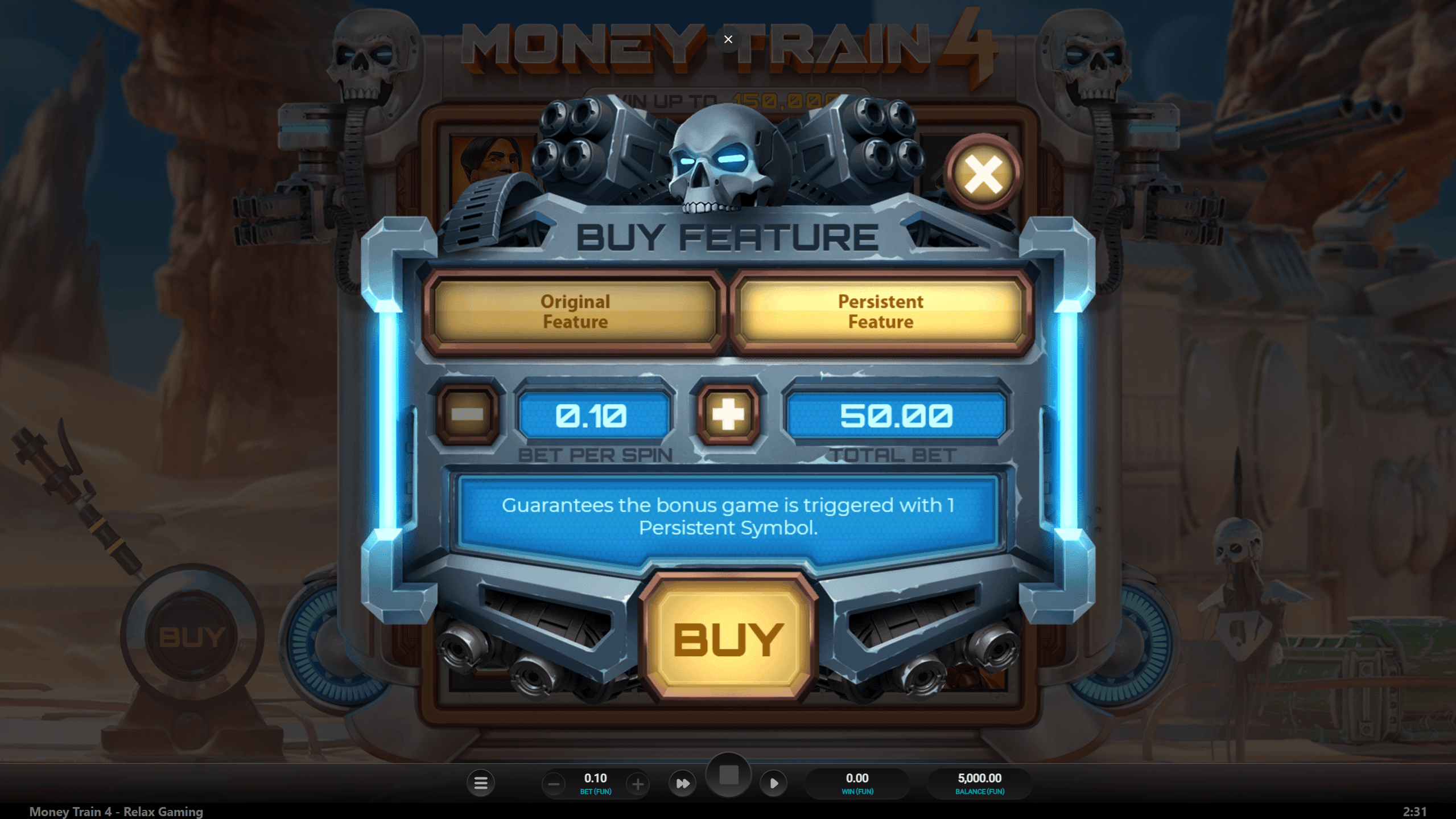Bonus Buy opciók: 50× (több szimbólum), 500× (Persistent modifier), 1 000× (Guaranteed Super Persistent).